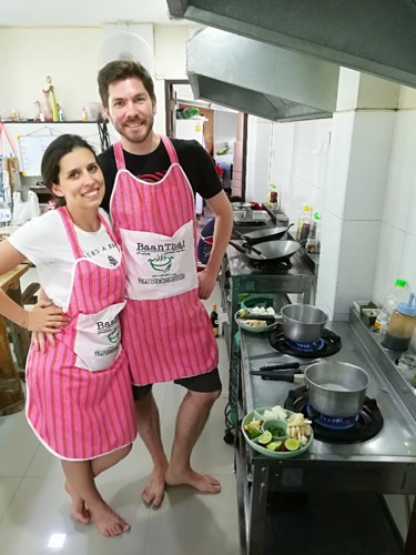 Em Chiang Mai há escolas a oferecerem aulas de culinária até dizer chega. Paletes! Nós fizemos com a BaanThai - Thai Cookery School e foi um dos pontos altos da nossa viagem. Equipa jovem, simpática, com um nível de inglês decente (a contrastar com quase todo o resto da viagem). Como eramos só dois nesse dia, tivemos direito a atenção total e entre nós os dois, escolhemos 10 pratos diferentes. Assim cozinhamos: Frango com caju; Fish Cake; Frango com leite de coco; Kao Soi; Manga com Sticky rice; Pad Thai; Spring rolls; Tom Yam Soup; Banana frita.